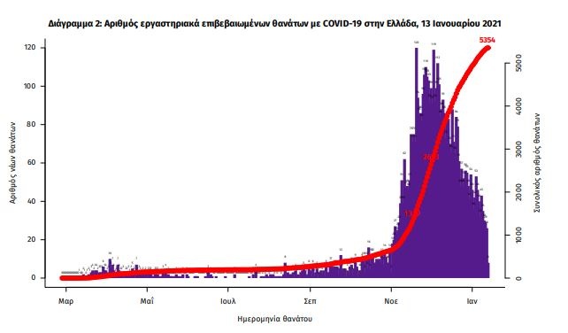 Η διαχρονική εξέλιξη των συνολικών κρουσμάτων και συνολικού αριθμού των θανάτων ασθενών COVID-19 παρουσιάζεται στο ακόλουθο διάγραμμα.