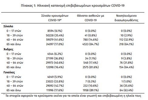Η ηλικιακή κατανομή των (α) συνολικών κρουσμάτων, (β) των περιστατικών που κατέληξαν σε θάνατο και (γ) των ασθενών που νοσηλεύονται διασωληνωμένοι, είναι η ακόλουθη: