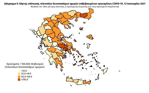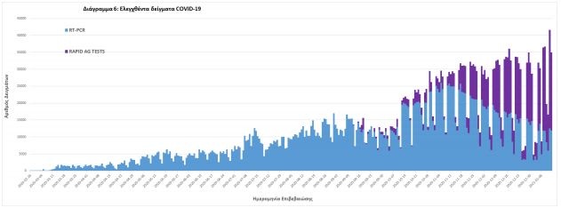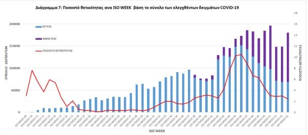 Την εβδομάδα 04 - 10 Ιανουαρίου (Iso Week 01) το ποσοστό θετικότητας ήταν 2,49% σε σύνολο 68.682 RT-PCR και 111.816 Rapid Ag τεστ που πραγματοποιήθηκαν.