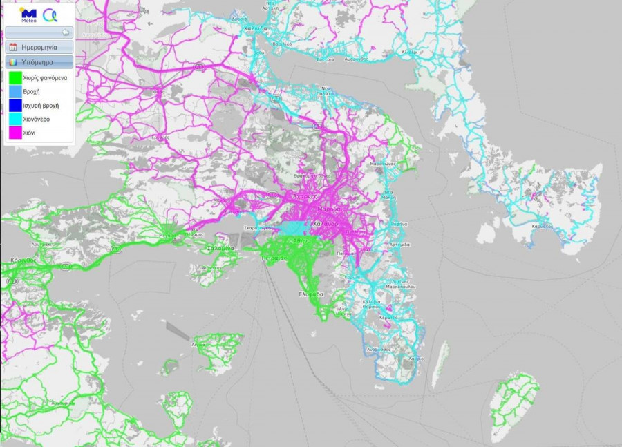 Στην εικόνα που ακολουθεί παρουσιάζονται οι συνθήκες που αναμένεται να επικρατήσουν στο οδικό δίκτυο της Αττικής και των όμορων περιοχών το βράδυ του Σαββάτου 16/1. Με μωβ αποχρώσεις φαίνονται οι οδικοί άξονες όπου αναμένεται χιονόπτωση και με ανοικτό γαλάζιο οι οδικοί άξονες όπου αναμένεται χιονόνερο.
