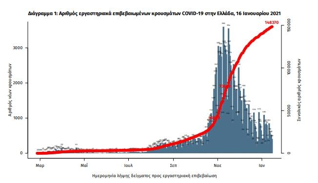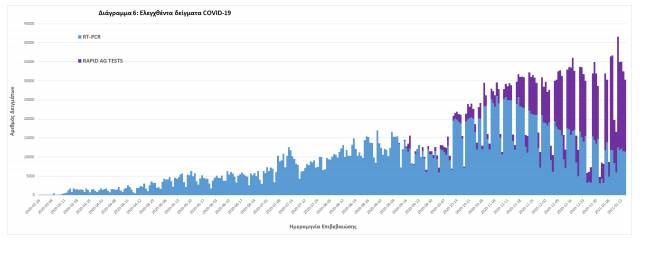 Δείγματα που έχουν ελεγχθεί: Από την 1η Ιανουαρίου 2020 μέχρι σήμερα, στα εργαστήρια που διενεργούν ελέγχους για τον νέο κορoνοϊό (SARS-CoV-2) και που δηλώνουν συστηματικά στον ΕΟΔΥ το σύνολο των δειγμάτων που ελέγχουν, έχουν συνολικά ελεγχθεί 2.956.862 κλινικά δείγματα ενώ από Μονάδες Υγείας και Κλιμάκια του ΕΟΔΥ που διενεργούν ελέγχους Rapid Ag έχουν ελεγχθεί 830.881 δείγματα