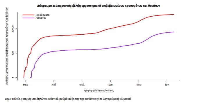 Η διαχρονική εξέλιξη των συνολικών κρουσμάτων και συνολικού αριθμού των θανάτων ασθενών COVID-19 παρουσιάζεται στο ακόλουθο διάγραμμα.
