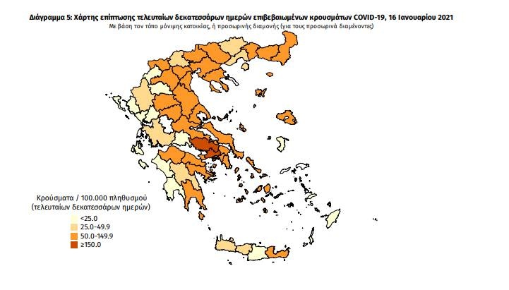Ο χάρτης αποτυπώνει τη γεωγραφική κατανομή των συνολικών κρουσμάτων COVID-19 (από την αρχή της επιδημίας) ανά Περιφερειακή Ενότητα της χώρας, με βάση την δηλωθείσα διεύθυνση μόνιμης κατοικίας του ασθενούς, ή τη διεύθυνση προσωρινής διαμονής για τους τουρίστες και άλλους προσωρινά διαμένοντες στην Ελλάδα.