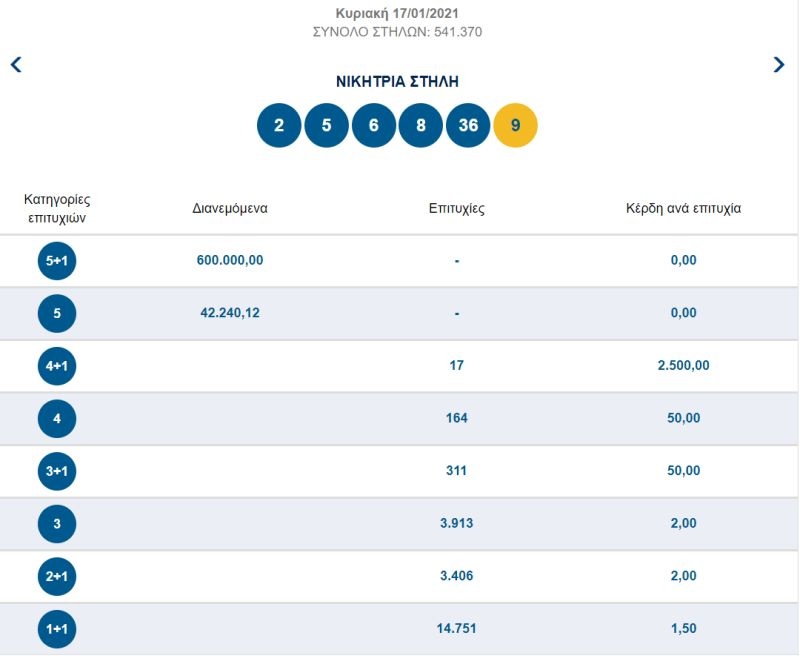 Υπενθυμίζεται ότι οι τυχεροί αριθμοί που έβγαλε η κληρωτίδα της περασμένης κλήρωσης ήταν οι: 8, 2, 36, 5, 6 και Τζόκερ ο αριθμός 9.
