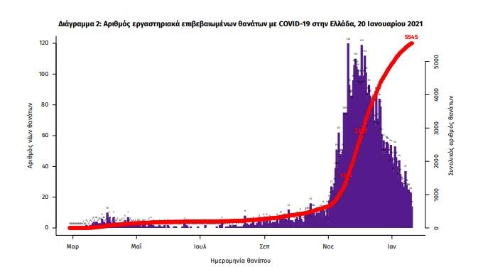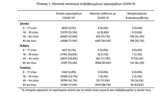 Τέλος, έχουμε 27 νέους θανάτους από τη νόσο COVID-19, φθάνοντας τους 5.545 θανάτους συνολικά στη χώρα, εκ των οποίων 3271 (59.0%) άνδρες. Η διάμεση ηλικία των θανόντων συμπολιτών μας ήταν τα 79 έτη και το 95.4% είχε κάποιο υποκείμενο νόσημα ή/και ηλικία 70 ετών και άνω.