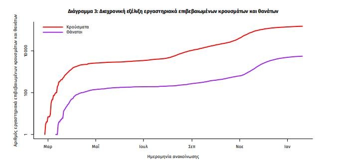 Η διαχρονική εξέλιξη των συνολικών κρουσμάτων και συνολικού αριθμού των θανάτων ασθενών COVID-19 παρουσιάζεται στο ακόλουθο διάγραμμα.