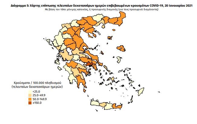 Ο χάρτης αποτυπώνει τη γεωγραφική κατανομή των συνολικών κρουσμάτων COVID-19 (από την αρχή της επιδημίας) ανά Περιφερειακή Ενότητα της χώρας, με βάση την δηλωθείσα διεύθυνση μόνιμης κατοικίας του ασθενούς, ή τη διεύθυνση προσωρινής διαμονής για τους τουρίστες και άλλους προσωρινά διαμένοντες στην Ελλάδα.