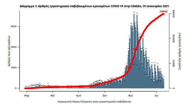Η διαχρονική εξέλιξη των συνολικών κρουσμάτων και συνολικού αριθμού των θανάτων ασθενών COVID-19 παρουσιάζεται στο ακόλουθο διάγραμμα.