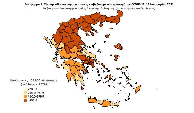Ο χάρτης αποτυπώνει τη γεωγραφική κατανομή των συνολικών κρουσμάτων COVID-19 (από την αρχή της επιδημίας) ανά Περιφερειακή Ενότητα της χώρας, με βάση την δηλωθείσα διεύθυνση μόνιμης κατοικίας του ασθενούς, ή τη διεύθυνση προσωρινής διαμονής για τους τουρίστες και άλλους προσωρινά διαμένοντες στην Ελλάδα.