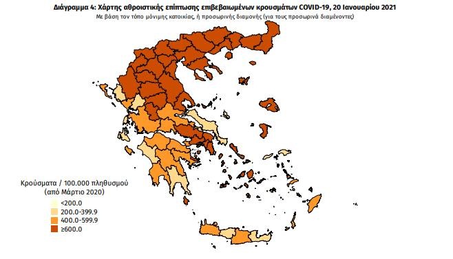 Ο χάρτης αποτυπώνει τη γεωγραφική κατανομή των συνολικών κρουσμάτων COVID-19 (από την αρχή της επιδημίας) ανά Περιφερειακή Ενότητα της χώρας, με βάση την δηλωθείσα διεύθυνση μόνιμης κατοικίας του ασθενούς, ή τη διεύθυνση προσωρινής διαμονής για τους τουρίστες και άλλους προσωρινά διαμένοντες στην Ελλάδα.