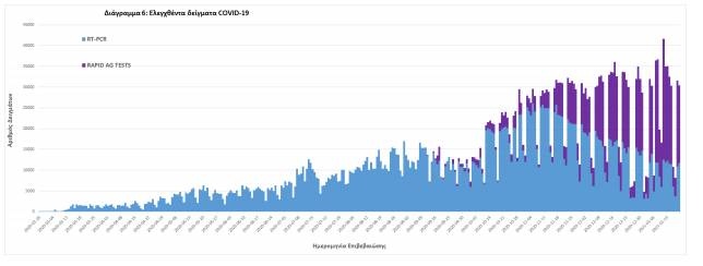 Δείγματα που έχουν ελεγχθεί: Από την 1η Ιανουαρίου 2020 μέχρι σήμερα, στα εργαστήρια που διενεργούν ελέγχους για τον νέο κορονοϊό (SARS-CoV-2) και που δηλώνουν συστηματικά στον ΕΟΔΥ το σύνολο των δειγμάτων που ελέγχουν, έχουν συνολικά ελεγχθεί 2.989.339 κλινικά δείγματα ενώ από Μονάδες Υγείας και Κλιμάκια του ΕΟΔΥ που διενεργούν ελέγχους Rapid Ag έχουν ελεγχθεί 879.400 δείγματα.