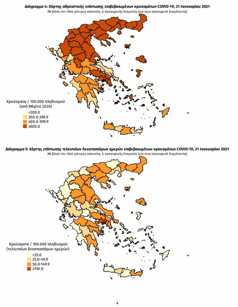 Διψήφιο αριθμό κρουσμάτων είχαν την Πέμπτη Αχαΐα, Βοιωτία, Ημαθία, Κοζάνη, Λάρισα, Μαγνησία, Πιερία και Ροδόπη, ενώ στη Μύκονο καταγράφηκαν τρία νέα κρούσματα, με τον μέσο όρο των τελευταίων επτά ημερών να είναι 0,71 ενώ ο αριθμός αυτός αναγάγεται σε 29,6 κρούσματα ανά 100.000 πληυθυσμού, γεγονός ανησυχητικό καθώς σε αυτόν τον δείκτη έχει ξεκαθαριστεί πως το όριο για τον συναγερμό είναι το 20.