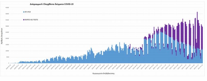 Δείγματα που έχουν ελεγχθεί: Από την 1η Ιανουαρίου 2020 μέχρι σήμερα, στα εργαστήρια που διενεργούν ελέγχους για τον νέο κορονοϊό (SARS-CoV-2) και που δηλώνουν συστηματικά στον ΕΟΔΥ το σύνολο των δειγμάτων που ελέγχουν, έχουν συνολικά ελεγχθεί 3.000.313 κλινικά δείγματα ενώ από Μονάδες Υγείας και Κλιμάκια του ΕΟΔΥ που διενεργούν ελέγχους Rapid Ag έχουν ελεγχθεί 897.881 δείγματα.