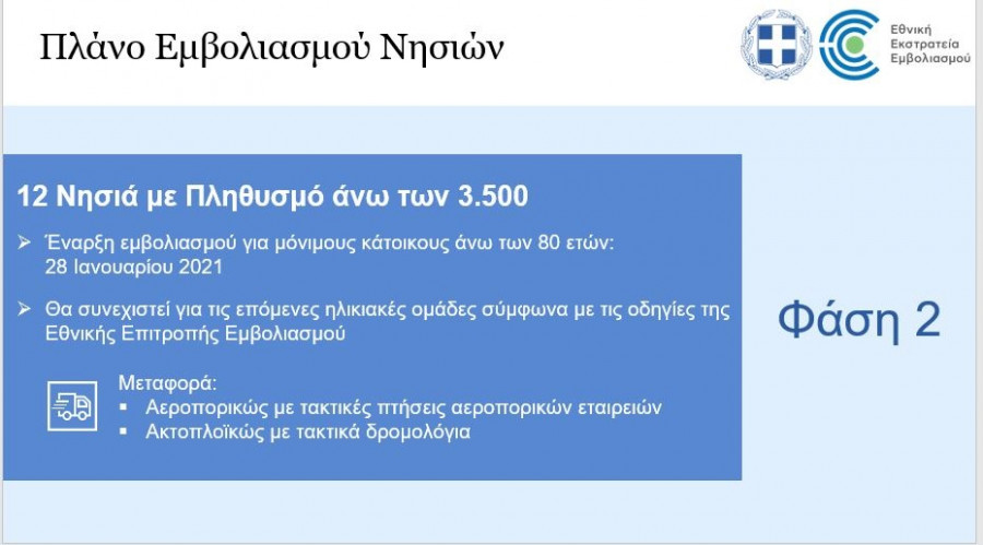 Η μεταφορά εμβολίων και υγειονομικού προσωπικού που τυχόν απαιτηθεί θα γίνεται με εναέρια μέσα που διαθέτει το ΓΕΕΘΑ, η ΓΓΠΠ καθώς και σκάφη του Λιμενικού Σώματος. Η έναρξη γίνεται με το Καστελόριζο, όπου από 27 έως και 30 Ιανουαρίου θα γίνει ο εμβολιασμός στο σύνολο των επιθυμούντων κατοίκων άνω των 18 ετών.