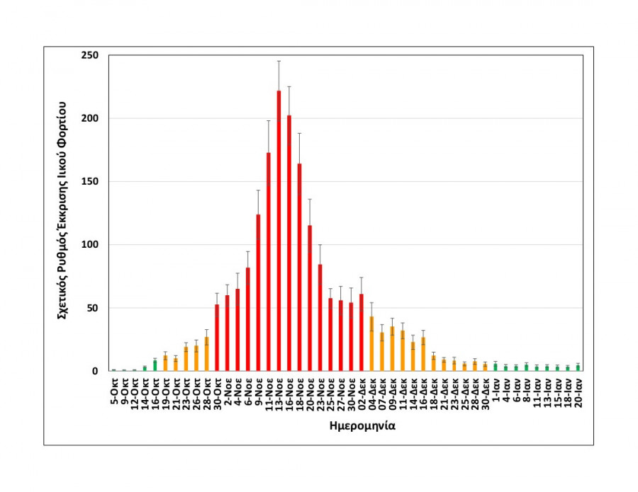 Στις δύο συνημμένες φωτογραφίες του διαγράμματος που δημοσιεύει το ΑΠΕ-ΜΠΕ αποτυπώνονται οι κλίμακες έκκρισης ιικού φορτίου: Στην πρώτη φαίνονται σε μεγαλύτερο εύρος χρόνου --από τις 2 Οκτωβρίου 2020 έως και την τελευταία μέτρηση της 20ης Ιανουαρίου για την οποία σήμερα ολοκληρώθηκε ο περιβαλλοντικός εξορθολογισμός.