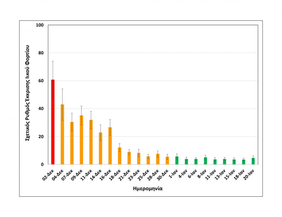 Στη δεύτερη μπορούν να διακριθούν ξεκάθαρα οι μικρές στα όρια του σφάλματος αυξομειώσεις του ιικού φορτίου από την 1η Ιανουαρίου, σταθερά σε χαμηλά επίπεδα.