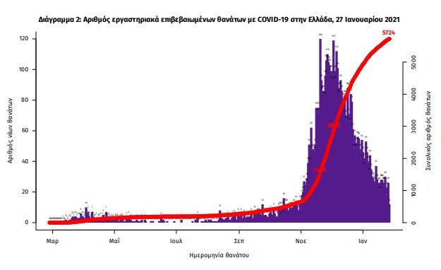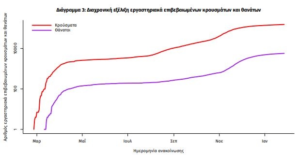 Η διαχρονική εξέλιξη των συνολικών κρουσμάτων και συνολικού αριθμού των θανάτων ασθενών COVID-19 παρουσιάζεται στο ακόλουθο διάγραμμα.