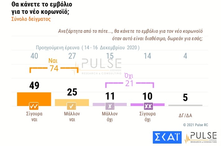 Συγκεκριμένα, αναφορικά με το αν θα κάνουν το εμβόλιο για τον κορονοϊό το 74% των ερωτηθέντων δηλώνει σίγουρα ναι (49%) ή μάλλον ναι (25%) έναντι 67% στην προηγούμενη δημοσκόπηση του Δεκεμβρίου, ενώ 21% συνολικά απαντά μάλλον όχι (11%) και σίγουρα όχι (10%) έναντι 29% στην προηγούμενη έρευνα.