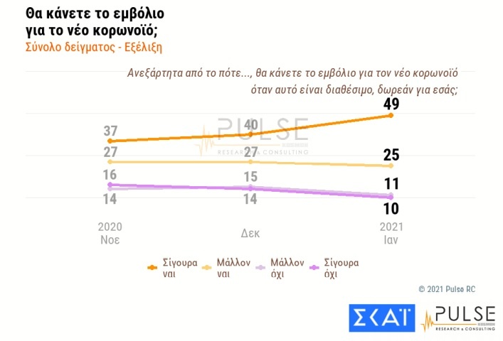 Σημειώνεται ότι το Νοέμβριο το 37% των ερωτηθέντων έλεγαν ότι σίγουρα θα εμβολιαστούν, έναντι του 40% το Δεκέμβριο και του 49% τον Ιανουάριο.