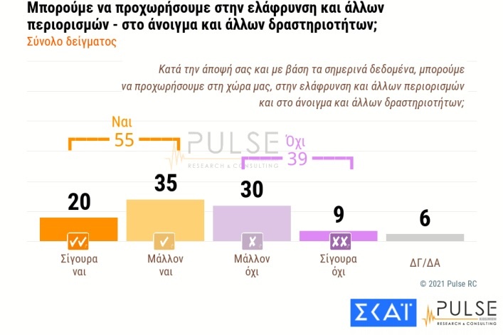 Όσον αφορά το ενδεχόμενο ελάφρυνσης και άλλων περιορισμών ή το άνοιγμα άλλων δραστηριοτήτων στη χώρα μας με βάση τα σημερινά δεδομένα, το 55% συνολικά απαντά σίγουρα ναι (20%) ή μάλλον ναι (35%), ενώ το 39% απαντά μάλλον όχι (30%), και σίγουρα όχι (9%).