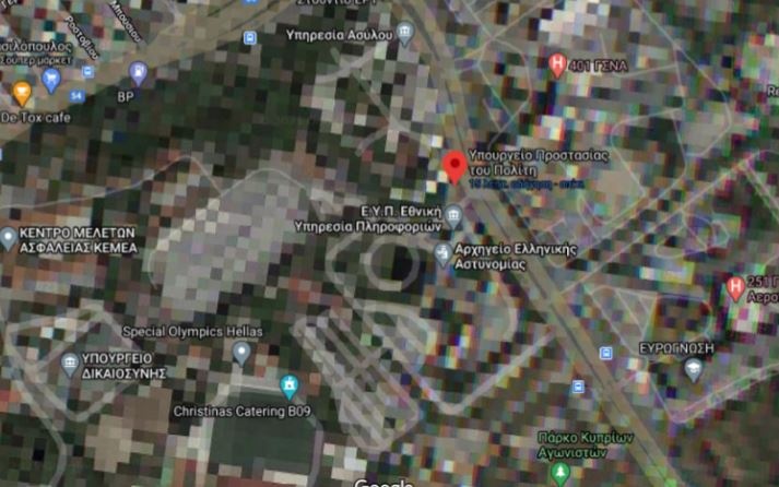 Το Υπουργείο Προστασίας του Πολίτης βρίσκεται στη Λεωφόρο Παναγιώτη Κανελλόπουλου. Και ενώ στον απλό χάρτη μπορείς να δεις πώς θα προσεγγίσεις το σημείο, δεν συμβαίνει το ίδιο και με τον δορυφορικό. Εκεί τα πράγματα γίνονται θολά. Και δεν γίνονται θολά μόνο για το Υπουργείο αλλά και για την γύρω περιοχή. Μαζί καλύπτεται και το 251 Νοσοκομείο Αεροπορίας το οποίο βρίσκεται κάποια στενά πιο μακριά. Όπως επίσης και το Υπουργείο Δικαιοσύνης και το Κέντρο Μελετών Ασφαλείας (ΚΕΜΕΑ). Πολύ κοντά βρίσκεται και το Πάρκο της Χωροφυλακής στη Μεσογείων το οποίο επίσης δεν μπορείς να διακρίνεις μέσω του δορυφόρου.