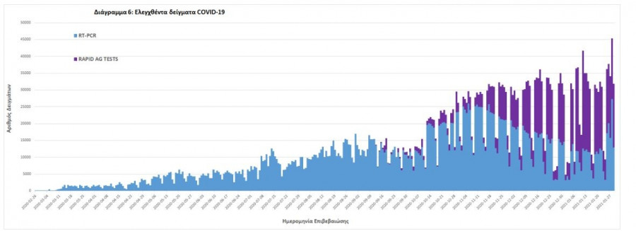 Δείγματα που έχουν ελεγχθεί: Από την 1η Ιανουαρίου 2020 μέχρι σήμερα, στα εργαστήρια που διενεργούν ελέγχους για τον νέο κορονοϊό (SARS-CoV-2) και που δηλώνουν συστηματικά στον ΕΟΔΥ το σύνολο των δειγμάτων που ελέγχουν, έχουν συνολικά ελεγχθεί 3.127.309 κλινικά δείγματα ενώ από Μονάδες Υγείας και Κλιμάκια του ΕΟΔΥ που διενεργούν ελέγχους Rapid Ag έχουν ελεγχθεί 1.040.849 δείγματα.