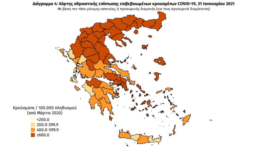 Γεωγραφική διασποράΟ χάρτης αποτυπώνει τη γεωγραφική κατανομή των συνολικών κρουσμάτων COVID-19 (από την αρχή της επιδημίας) ανά Περιφερειακή Ενότητα της χώρας, με βάση την δηλωθείσα διεύθυνση μόνιμης κατοικίας του ασθενούς, ή τη διεύθυνση προσωρινής διαμονής για τους τουρίστες και άλλους προσωρινά διαμένοντες στην Ελλάδα. Συμπεριλαμβάνονται τόσο κρούσματα με ιστορικό ταξιδίου (“εισαγόμενα”) όσο και κρούσματα με πιθανή εγχώρια μετάδοση.