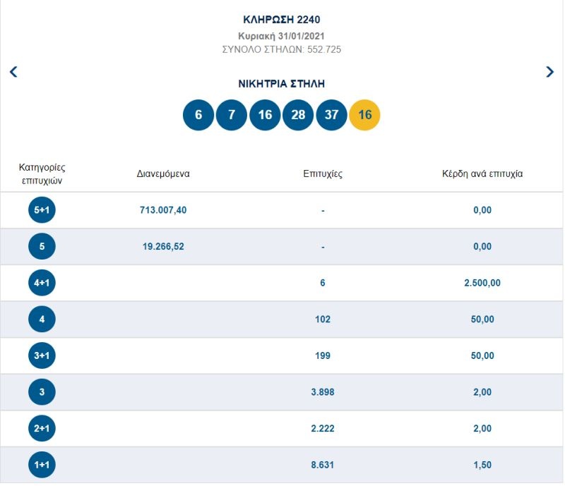 Οι τυχεροί αριθμοί που έβγαλε η κληρωτίδα της αποψινής κλήρωσης είναι οι: 6, 7, 16, 28, 37 και Τζόκερ ο αριθμός 16.