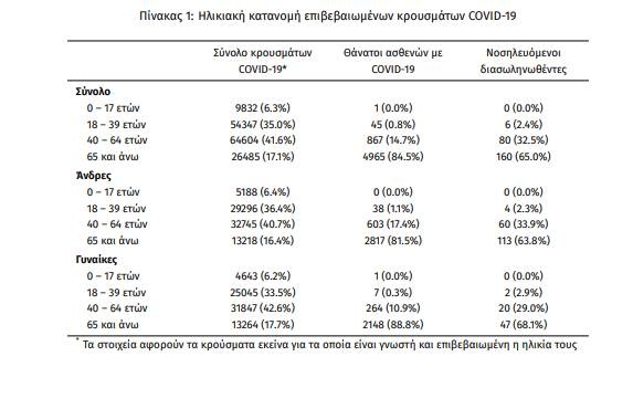 Τέλος, σύμφωνα με τον ΕΟΔΥ, έχουμε 27 νέους θανάτους από τη νόσο COVID-19, φθάνοντας τους 5.878 θανάτους συνολικά στη χώρα, εκ των οποίων 3.457 (58,8%) άνδρες. Η διάμεση ηλικία των θανόντων συμπολιτών μας ήταν τα 79 έτη και το 95,5% είχε κάποιο υποκείμενο νόσημα ή/και ηλικία 70 ετών και άνω.