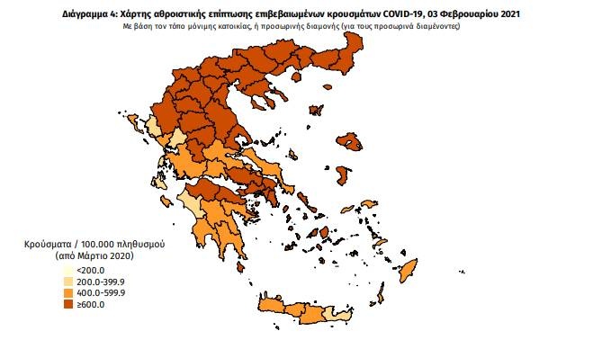 Ο χάρτης αποτυπώνει τη γεωγραφική κατανομή των συνολικών κρουσμάτων COVID-19 (από την αρχή της επιδημίας) ανά Περιφερειακή Ενότητα της χώρας, με βάση την δηλωθείσα διεύθυνση μόνιμης κατοικίας του ασθενούς, ή τη διεύθυνση προσωρινής διαμονής για τους τουρίστες και άλλους προσωρινά διαμένοντες στην Ελλάδα.
