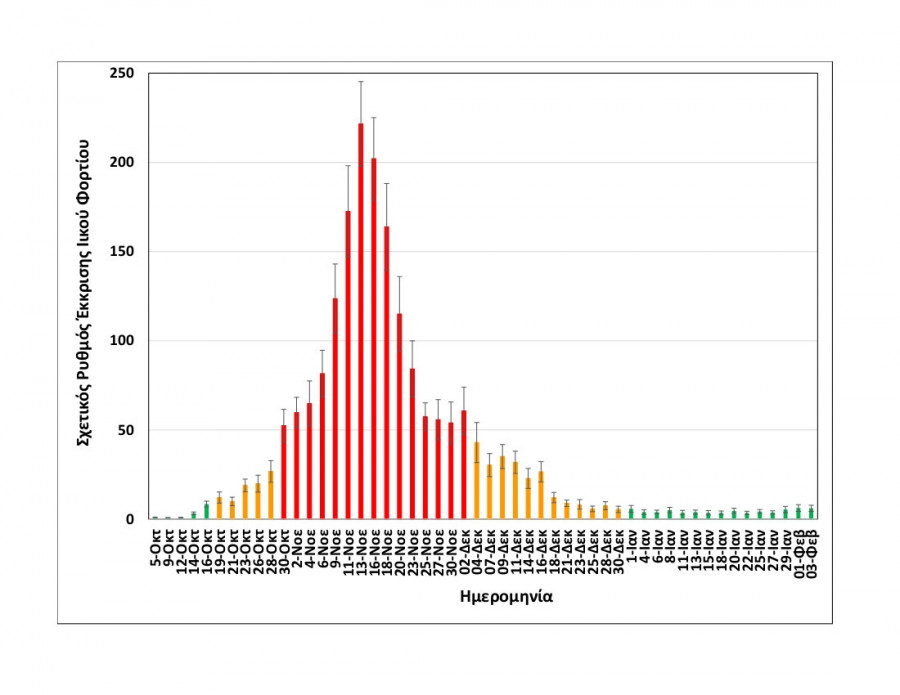 Στα διαγράμματα που παρουσιάζει το ΑΠΕ-ΜΠΕ οι ημέρες των δειγματοληψιών που καταγράφονται με κόκκινο χρώμα αντιστοιχούν σε περισσότερα από 500 κρούσματα - όπως ανακοινώθηκαν τις αντίστοιχες ημέρες από τον ΕΟΔΥ - οι μέρες που καταγράφονται με πορτοκαλί σε 100-400 κρούσματα και οι μέρες που καταγράφονται με πράσινο σε λιγότερα από εκατό κρούσματα.