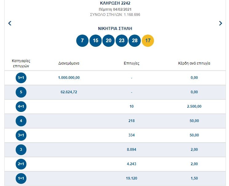 Υπενθυμίζεται ότι οι τυχεροί αριθμοί που έβγαλε η κληρωτίδα της περασμένης κλήρωσης ήταν οι: 7, 15, 20, 23, 28 και Τζόκερ ο αριθμός 17.