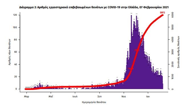 Η διαχρονική εξέλιξη των συνολικών κρουσμάτων και συνολικού αριθμού των θανάτων ασθενών COVID-19 παρουσιάζεται στο ακόλουθο διάγραμμα.