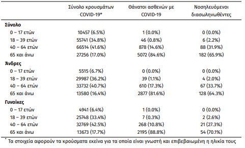 Τέλος, σύμφωνα με τον ΕΟΔΥ, έχουμε 25 νέους θανάτους από τη νόσο COVID-19, φθάνοντας τους 5.997 θανάτους συνολικά στη χώρα, εκ των οποίων 3.525 (58,8%) άνδρες. Η διάμεση ηλικία των θανόντων συμπολιτών μας ήταν τα 79 έτη και το 95,6% είχε κάποιο υποκείμενο νόσημα ή/και ηλικία 70 ετών και άνω.