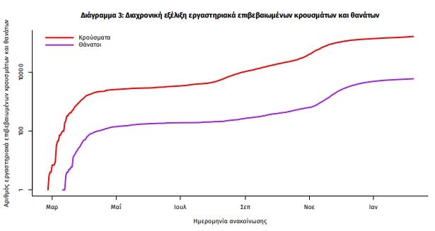 Η διαχρονική εξέλιξη των συνολικών κρουσμάτων και συνολικού αριθμού των θανάτων ασθενών COVID-19 παρουσιάζεται στο ακόλουθο διάγραμμα: