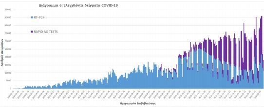Από την 1η Ιανουαρίου 2020 μέχρι σήμερα, στα εργαστήρια που διενεργούν ελέγχους για τον νέο κορooνοϊό (SARS-CoV-2) και που δηλώνουν συστηματικά στον ΕΟΔΥ το σύνολο των δειγμάτων που ελέγχουν, έχουν συνολικά ελεγχθεί 3.253.668 κλινικά δείγματα ενώ από Μονάδες Υγείας και Κλιμάκια του ΕΟΔΥ που διενεργούν ελέγχους Rapid Ag έχουν ελεγχθεί 1.191.775 δείγματα.