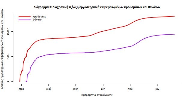Η διαχρονική εξέλιξη των συνολικών κρουσμάτων και συνολικού αριθμού των θανάτων ασθενών COVID-19 παρουσιάζεται στο ακόλουθο διάγραμμα.