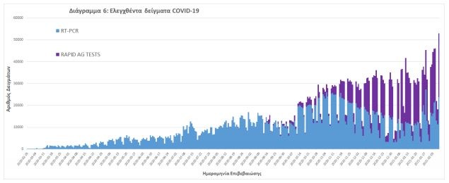 Από την 1η Ιανουαρίου 2020 μέχρι σήμερα, στα εργαστήρια που διενεργούν ελέγχους για τον νέο κορoνοϊό (SARS-CoV-2) και που δηλώνουν συστηματικά στον ΕΟΔΥ το σύνολο των δειγμάτων που ελέγχουν, έχουν συνολικά ελεγχθεί 3.277.437 κλινικά δείγματα ενώ από Μονάδες Υγείας και Κλιμάκια του ΕΟΔΥ που διενεργούν ελέγχους Rapid Ag έχουν ελεγχθεί 1.221.021 δείγματα.