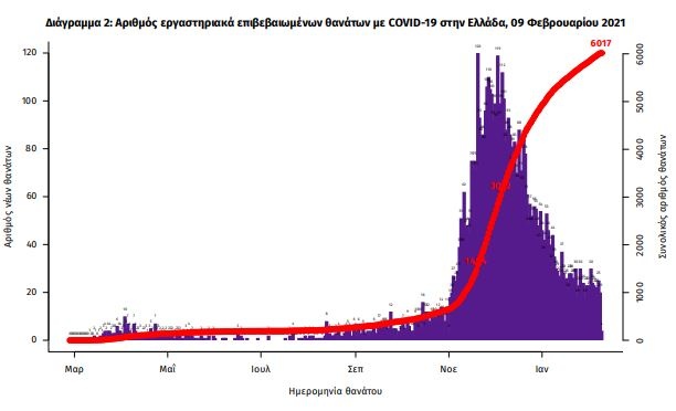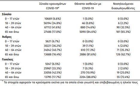 Τέλος, έχουμε 20 νέους θανάτους από τη νόσο COVID-19, φθάνοντας τους 6017 θανάτους συνολικά στη χώρα, εκ των οποίων 3534 (58.7%) άνδρες. Η διάμεση ηλικία των θανόντων συμπολιτών μας ήταν τα 79 έτη και το 95.6% είχε κάποιο υποκείμενο νόσημα ή/και ηλικία 70 ετών και άνω.