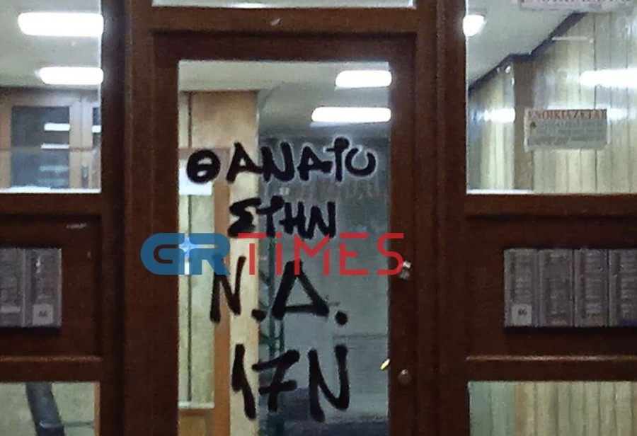 Όπως αναφέρει το GRtimes.gr, άτομα – μέλη του ευρύτερου αντιεξουσιαστικού χώρου που συμμετείχαν στην πορεία κατά του Νομοσχεδίου του Υπ. Παιδείας στο κέντρο της Θεσσαλονίκης βγήκαν από την πορεία και έγραψαν το σύνθημα στην πόρτα του κτηρίου.