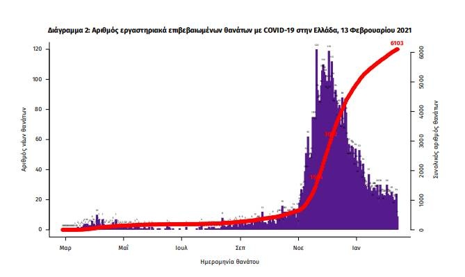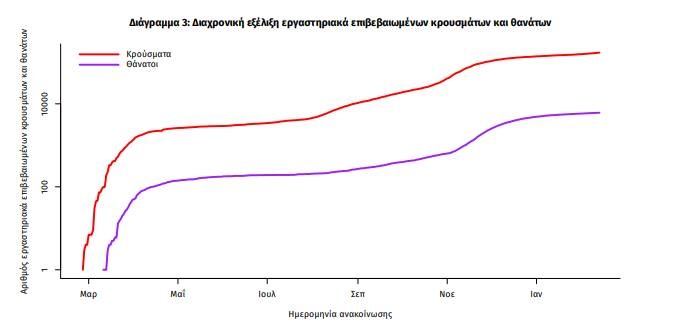 Η διαχρονική εξέλιξη των συνολικών κρουσμάτων και συνολικού αριθμού των θανάτων ασθενών COVID-19 παρουσιάζεται στο ακόλουθο διάγραμμα