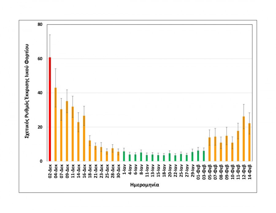 Η μέση τιμή συγκέντρωσης του ιικού φορτίου την εβδομάδα από 8 έως 14 Φεβρουαρίου είναι κατά 70% αυξημένη σε σχέση με τη μέση τιμή της προηγούμενης εβδομάδας, 1 με 7 Φεβρουαρίου. Σε ημερήσια βάση, η υψηλότερη τιμή καταγράφεται την Παρασκευή 12 Φεβρουαρίου.