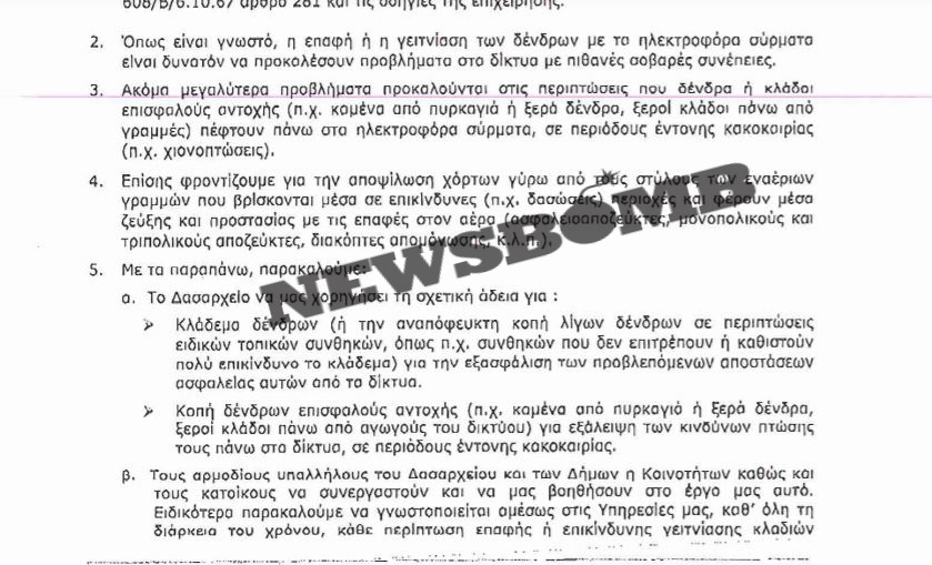 Στη συνέχεια του εγγράφου φαίνεται ξεκάθαρα ότι ο ΔΕΔΔΗΕ ζητά σχετική άδεια από το δασαρχείο και ζητά από τους Δήμους να παραχωρήσουν προσωπικό και τη σχετική βοήθεια για να γίνουν οι εργασίες κλαδέματος των δέντρων.