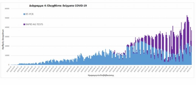Από την 1η Ιανουαρίου 2020 μέχρι σήμερα, στα εργαστήρια που διενεργούν ελέγχους για τον νέο κορoνοϊό (SARS-CoV-2) και που δηλώνουν συστηματικά το σύνολο των δειγμάτων που ελέγχουν, έχουν συνολικά ελεγχθεί 3.444.687 κλινικά δείγματα ενώ από Μονάδες Υγείας και Κλιμάκια του ΕΟΔΥ που διενεργούν ελέγχους Rapid Ag έχουν ελεγχθεί 1.385.729 δείγματα. O μέσος όρος του επταημέρου είναι 32.810 δειγματοληπτικοί έλεγχοι.
