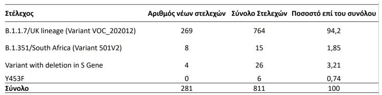 Β.1.1.7/UKlineage (Variant VOC_202012) (Πίνακας 4) και 15 θετικά για την παρουσία μετάλλαξης B.1.351/South Africa (Variant 501V2) από την