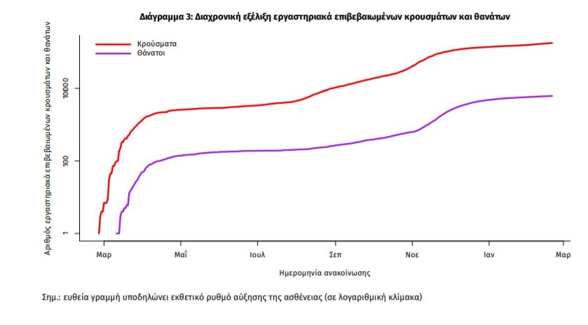 Η διαχρονική εξέλιξη των συνολικών κρουσμάτων και συνολικού αριθμού των θανάτων ασθενών COVID-19 παρουσιάζεται στο ακόλουθο διάγραμμα.