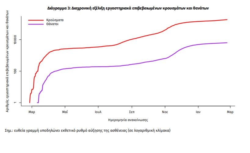 Η διαχρονική εξέλιξη των συνολικών κρουσμάτων και συνολικού αριθμού των θανάτων ασθενών COVID-19 παρουσιάζεται στο ακόλουθο διάγραμμα.