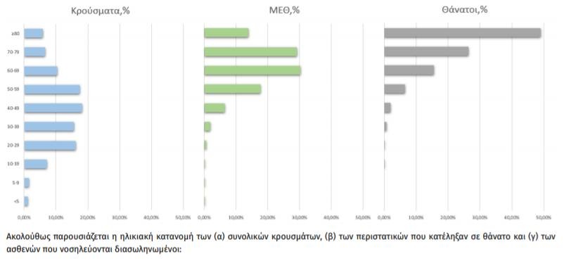 Ακολούθως παρουσιάζεται η ηλικιακή κατανομή των (α) συνολικών κρουσμάτων, (β) των περιστατικών που κατέληξαν σε θάνατο και (γ) των ασθενών που νοσηλεύονται διασωληνωμένοι: