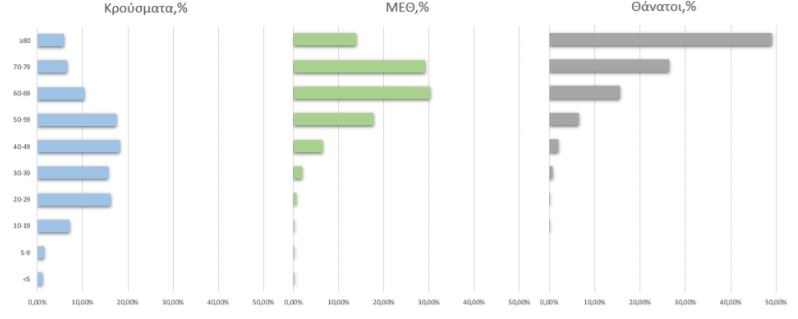 Ακολούθως παρουσιάζεται η ηλικιακή κατανομή των (α) συνολικών κρουσμάτων, (β) των περιστατικών που κατέληξαν σε θάνατο και (γ) των ασθενών που νοσηλεύονται διασωληνωμένοι: