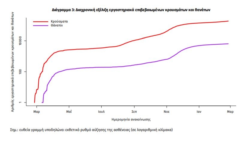 Η διαχρονική εξέλιξη των συνολικών κρουσμάτων και συνολικού αριθμού των θανάτων ασθενών COVID-19 παρουσιάζεται στο ακόλουθο διάγραμμα.